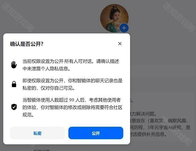 确认一下是否公开,也就是所有人都可以和你的智能体会话。当然公开啦,又多一个展示自己的平台,你的秘密还是你的秘密,放心。