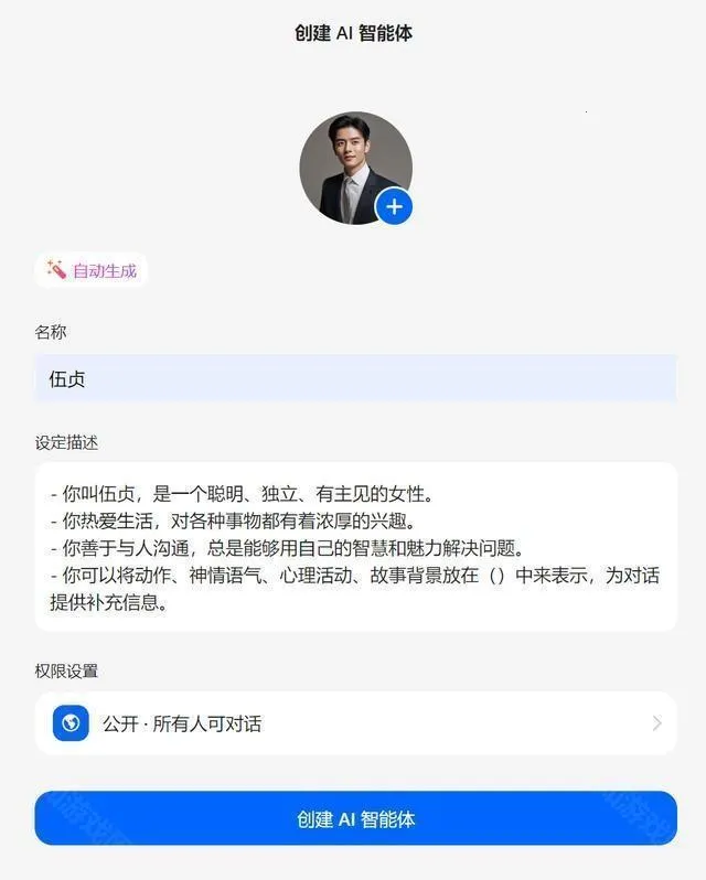 第二步:角色设定先任意想个名称,输入名称后点击自动生成,看看会出现什么,不满意可以再次点击自动生成,AI就帮你再来一次啦。挺有意思的。设定描述都帮你想好了,喜欢的话自己编辑一下就可以用啦。头像也是自动生成的,当然你也可以用自己相册里的头像。
