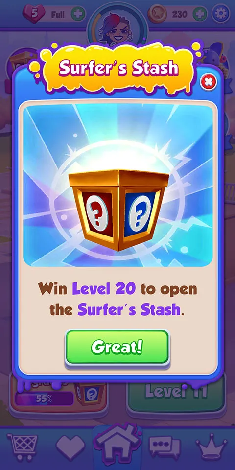 独特三消玩法:采用经典三消,排列相同颜色方块消除,完成任务获奖励、解锁新关卡。