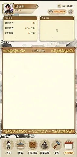 合理规划资源,建造十余种功能各异的建筑并升级,派遣弟子外出工作,构建完善门派资源供给体系。