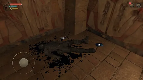 游戏中,玩家进入金字塔后滑动屏幕观察四周,拖动左侧摇杆移动。出现放大镜表示有线索,靠近发光物品可获线索、武器和装备。界面左上方显示血量、体力和移动速度,右侧有指南针、角色养成和设置等。点击右上角设置按钮可保存进度、学习技能、升级武器和补给子弹。